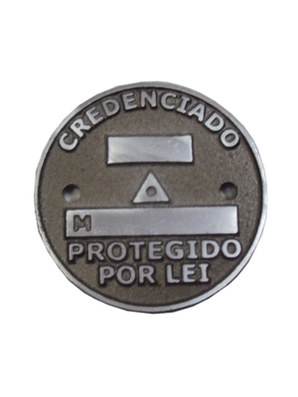Plaqueta Geodésica Furada com a descrição "Credenciado" e "Protegido por lei", também poderá ser feita a gravação do vértice e a matrícula do usuário.